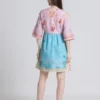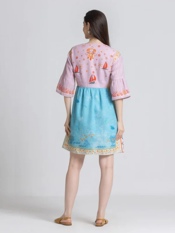 Designed to complement your shape, the dress features a V-neckline and button-down detailing for an effortlessly chic vibe. The three-quarter flared sleeves add a touch of playful sophistication, while the above-knee length keeps it modern and versatile.