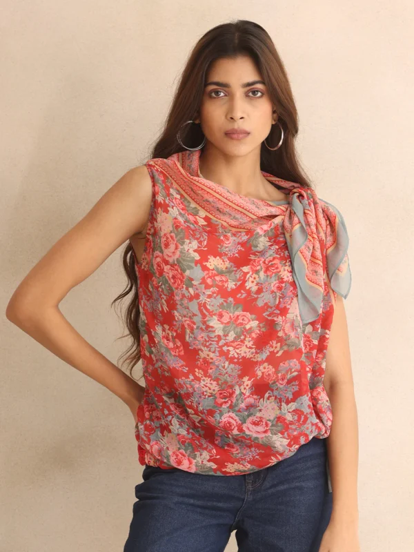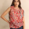 Red Cowl Neck Printed Sleeveless Drape Top with Cami